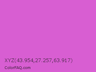 XYZ 43.954,27.257,63.917 Color is a light magenta color and the nearest color is Orchid #da70d6. Hex code #d85ed2 and RGB value is rgb(216,94,210). In RGB color space, this color is composed of 85% red, 37% green, 82% blue, In CMYK color space, this color is composed of 0% cyan, 56% magenta, 3% yellow , 15% black , In HSL color space, this color has a hue angle of 303° , 61% saturation and 61% lightness.