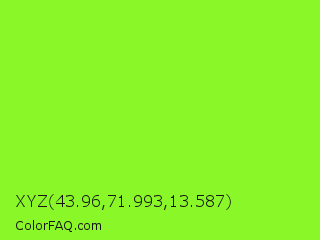 XYZ 43.96,71.993,13.587 Color is a normal green color and the nearest color is Spring Frost #87ff2a. Hex code #89f728 and RGB value is rgb(137,247,40). In RGB color space, this color is composed of 54% red, 97% green, 16% blue, In CMYK color space, this color is composed of 45% cyan, 0% magenta, 84% yellow , 3% black , In HSL color space, this color has a hue angle of 92° , 93% saturation and 56% lightness.