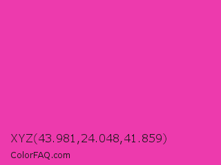 XYZ 43.981,24.048,41.859 Color is a normal magenta color and the nearest color is Frostbite #e936a7. Hex code #ed3aad and RGB value is rgb(237,58,173). In RGB color space, this color is composed of 93% red, 23% green, 68% blue, In CMYK color space, this color is composed of 0% cyan, 76% magenta, 27% yellow , 7% black , In HSL color space, this color has a hue angle of 321° , 83% saturation and 58% lightness.
