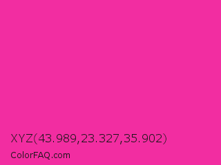 XYZ 43.989,23.327,35.902 Color is a normal magenta color and the nearest color is Persian Rose #fe28a2. Hex code #f22da1 and RGB value is rgb(242,45,161). In RGB color space, this color is composed of 95% red, 18% green, 63% blue, In CMYK color space, this color is composed of 0% cyan, 81% magenta, 33% yellow , 5% black , In HSL color space, this color has a hue angle of 325° , 88% saturation and 56% lightness.