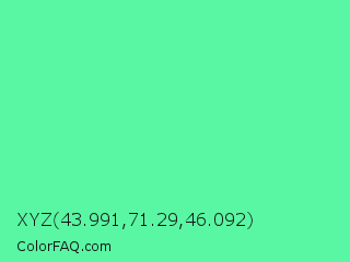 XYZ 43.991,71.29,46.092 Color is a light green color and the nearest color is Medium Aquamarine #66ddaa. Hex code #59f7a3 and RGB value is rgb(89,247,163). In RGB color space, this color is composed of 35% red, 97% green, 64% blue, In CMYK color space, this color is composed of 64% cyan, 0% magenta, 34% yellow , 3% black , In HSL color space, this color has a hue angle of 148° , 91% saturation and 66% lightness.