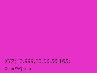 XYZ 43.999,23.06,56.165 Color is a normal magenta color and the nearest color is Razzle Dazzle Rose #ff33cc. Hex code #e630c7 and RGB value is rgb(230,48,199). In RGB color space, this color is composed of 90% red, 19% green, 78% blue, In CMYK color space, this color is composed of 0% cyan, 79% magenta, 13% yellow , 10% black , In HSL color space, this color has a hue angle of 310° , 78% saturation and 55% lightness.