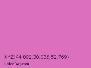 XYZ 44.002,30.036,52.769 Color is a light magenta color and the nearest color is Sky Magenta #cf71af. Hex code #da6fbf and RGB value is rgb(218,111,191). In RGB color space, this color is composed of 85% red, 44% green, 75% blue, In CMYK color space, this color is composed of 0% cyan, 49% magenta, 12% yellow , 15% black , In HSL color space, this color has a hue angle of 315° , 59% saturation and 65% lightness.