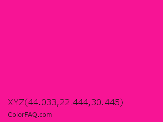 XYZ 44.033,22.444,30.445 Color is a normal magenta color and the nearest color is Fluorescent Pink #ff1493. Hex code #f71495 and RGB value is rgb(247,20,149). In RGB color space, this color is composed of 97% red, 8% green, 58% blue, In CMYK color space, this color is composed of 0% cyan, 92% magenta, 40% yellow , 3% black , In HSL color space, this color has a hue angle of 326° , 93% saturation and 52% lightness.