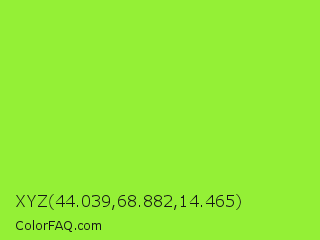 XYZ 44.039,68.882,14.465 Color is a normal green color and the nearest color is Kiwi #8ee53f. Hex code #94f036 and RGB value is rgb(148,240,54). In RGB color space, this color is composed of 58% red, 94% green, 21% blue, In CMYK color space, this color is composed of 38% cyan, 0% magenta, 78% yellow , 6% black , In HSL color space, this color has a hue angle of 90° , 86% saturation and 58% lightness.