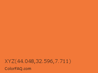 XYZ 44.048,32.596,7.711 Color is a normal orange color and the nearest color is Crusta #fd7b33. Hex code #f27838 and RGB value is rgb(242,120,56). In RGB color space, this color is composed of 95% red, 47% green, 22% blue, In CMYK color space, this color is composed of 0% cyan, 50% magenta, 77% yellow , 5% black , In HSL color space, this color has a hue angle of 21° , 88% saturation and 58% lightness.