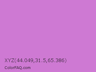 XYZ 44.049,31.5,65.386 Color is a light magenta color and the nearest color is French Mauve #d473d4. Hex code #ce79d3 and RGB value is rgb(206,121,211). In RGB color space, this color is composed of 81% red, 47% green, 83% blue, In CMYK color space, this color is composed of 2% cyan, 43% magenta, 0% yellow , 17% black , In HSL color space, this color has a hue angle of 297° , 51% saturation and 65% lightness.