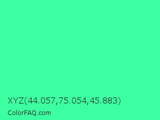 XYZ 44.057,75.054,45.883 Color is a light green color and the nearest color is Eucalyptus #44d7a8. Hex code #3cffa1 and RGB value is rgb(60,255,161). In RGB color space, this color is composed of 24% red, 100% green, 63% blue, In CMYK color space, this color is composed of 76% cyan, 0% magenta, 37% yellow , 0% black , In HSL color space, this color has a hue angle of 151° , 100% saturation and 62% lightness.