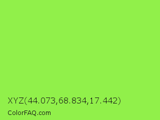 XYZ 44.073,68.834,17.442 Color is a light green color and the nearest color is Kiwi #8ee53f. Hex code #91f04a and RGB value is rgb(145,240,74). In RGB color space, this color is composed of 57% red, 94% green, 29% blue, In CMYK color space, this color is composed of 40% cyan, 0% magenta, 69% yellow , 6% black , In HSL color space, this color has a hue angle of 94° , 85% saturation and 62% lightness.