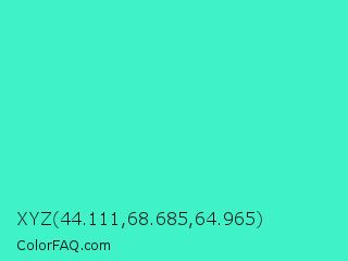 XYZ 44.111,68.685,64.965 Color is a normal cyan color and the nearest color is Turquoise #40e0d0. Hex code #3ff2c7 and RGB value is rgb(63,242,199). In RGB color space, this color is composed of 25% red, 95% green, 78% blue, In CMYK color space, this color is composed of 74% cyan, 0% magenta, 18% yellow , 5% black , In HSL color space, this color has a hue angle of 166° , 87% saturation and 60% lightness.