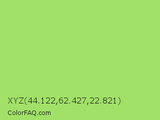 XYZ 44.122,62.427,22.821 Color is a light green color and the nearest color is Inchworm #b2ec5d. Hex code #a1e168 and RGB value is rgb(161,225,104). In RGB color space, this color is composed of 63% red, 88% green, 41% blue, In CMYK color space, this color is composed of 28% cyan, 0% magenta, 54% yellow , 12% black , In HSL color space, this color has a hue angle of 92° , 67% saturation and 65% lightness.