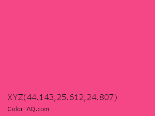XYZ 44.143,25.612,24.807 Color is a light rose color and the nearest color is Violet Red #f7468a. Hex code #f54785 and RGB value is rgb(245,71,133). In RGB color space, this color is composed of 96% red, 28% green, 52% blue, In CMYK color space, this color is composed of 0% cyan, 71% magenta, 46% yellow , 4% black , In HSL color space, this color has a hue angle of 339° , 90% saturation and 62% lightness.