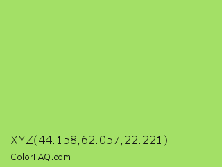 XYZ 44.158,62.057,22.221 Color is a light green color and the nearest color is Inchworm #b2ec5d. Hex code #a3e066 and RGB value is rgb(163,224,102). In RGB color space, this color is composed of 64% red, 88% green, 40% blue, In CMYK color space, this color is composed of 27% cyan, 0% magenta, 54% yellow , 12% black , In HSL color space, this color has a hue angle of 90° , 66% saturation and 64% lightness.