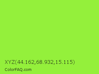 XYZ 44.162,68.932,15.115 Color is a normal green color and the nearest color is Kiwi #8ee53f. Hex code #94f03b and RGB value is rgb(148,240,59). In RGB color space, this color is composed of 58% red, 94% green, 23% blue, In CMYK color space, this color is composed of 38% cyan, 0% magenta, 75% yellow , 6% black , In HSL color space, this color has a hue angle of 90° , 86% saturation and 59% lightness.