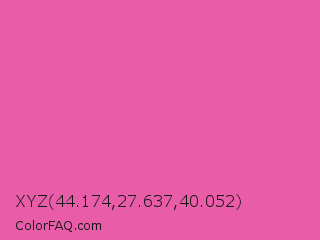 XYZ 44.174,27.637,40.052 Color is a light magenta color and the nearest color is Brilliant Rose #f653a6. Hex code #e85ca8 and RGB value is rgb(232,92,168). In RGB color space, this color is composed of 91% red, 36% green, 66% blue, In CMYK color space, this color is composed of 0% cyan, 60% magenta, 28% yellow , 9% black , In HSL color space, this color has a hue angle of 327° , 75% saturation and 64% lightness.