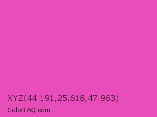 XYZ 44.191,25.618,47.963 Color is a normal magenta color and the nearest color is Brilliant Rose #f653a6. Hex code #e74cb8 and RGB value is rgb(231,76,184). In RGB color space, this color is composed of 91% red, 30% green, 72% blue, In CMYK color space, this color is composed of 0% cyan, 67% magenta, 20% yellow , 9% black , In HSL color space, this color has a hue angle of 318° , 76% saturation and 60% lightness.