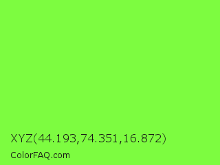 XYZ 44.193,74.351,16.872 Color is a light green color and the nearest color is Spring Frost #87ff2a. Hex code #7dfc40 and RGB value is rgb(125,252,64). In RGB color space, this color is composed of 49% red, 99% green, 25% blue, In CMYK color space, this color is composed of 50% cyan, 0% magenta, 75% yellow , 1% black , In HSL color space, this color has a hue angle of 101° , 97% saturation and 62% lightness.