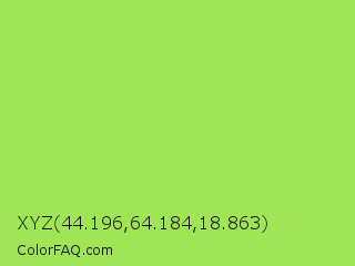 XYZ 44.196,64.184,18.863 Color is a light green color and the nearest color is Conifer #acdd4d. Hex code #a0e556 and RGB value is rgb(160,229,86). In RGB color space, this color is composed of 63% red, 90% green, 34% blue, In CMYK color space, this color is composed of 30% cyan, 0% magenta, 62% yellow , 10% black , In HSL color space, this color has a hue angle of 89° , 73% saturation and 62% lightness.