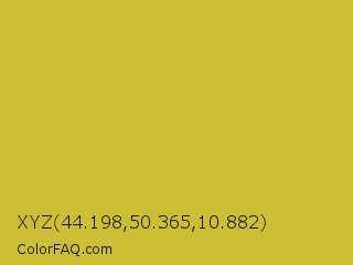 XYZ 44.198,50.365,10.882 Color is a normal yellow color and the nearest color is Earls Green #c9b93b. Hex code #ccbf36 and RGB value is rgb(204,191,54). In RGB color space, this color is composed of 80% red, 75% green, 21% blue, In CMYK color space, this color is composed of 0% cyan, 6% magenta, 74% yellow , 20% black , In HSL color space, this color has a hue angle of 55° , 60% saturation and 51% lightness.