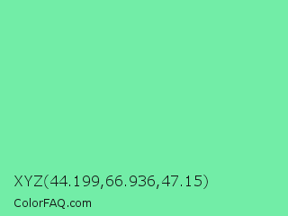 XYZ 44.199,66.936,47.15 Color is a light green color and the nearest color is Medium Aquamarine #66ddaa. Hex code #72eda7 and RGB value is rgb(114,237,167). In RGB color space, this color is composed of 45% red, 93% green, 65% blue, In CMYK color space, this color is composed of 52% cyan, 0% magenta, 30% yellow , 7% black , In HSL color space, this color has a hue angle of 146° , 77% saturation and 69% lightness.