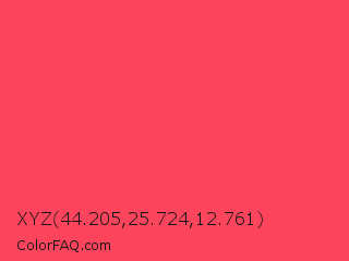 XYZ 44.205,25.724,12.761 Color is a light red color and the nearest color is Neon Fuchsia #fe4164. Hex code #fc455c and RGB value is rgb(252,69,92). In RGB color space, this color is composed of 99% red, 27% green, 36% blue, In CMYK color space, this color is composed of 0% cyan, 73% magenta, 63% yellow , 1% black , In HSL color space, this color has a hue angle of 352° , 97% saturation and 63% lightness.