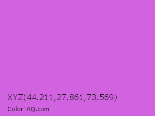 XYZ 44.211,27.861,73.569 Color is a light magenta color and the nearest color is Orchid #da70d6. Hex code #d163e0 and RGB value is rgb(209,99,224). In RGB color space, this color is composed of 82% red, 39% green, 88% blue, In CMYK color space, this color is composed of 7% cyan, 56% magenta, 0% yellow , 12% black , In HSL color space, this color has a hue angle of 293° , 67% saturation and 63% lightness.