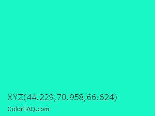 XYZ 44.229,70.958,66.624 Color is a normal cyan color and the nearest color is Bright Turquoise #08e8de. Hex code #1af7c9 and RGB value is rgb(26,247,201). In RGB color space, this color is composed of 10% red, 97% green, 79% blue, In CMYK color space, this color is composed of 89% cyan, 0% magenta, 19% yellow , 3% black , In HSL color space, this color has a hue angle of 168° , 93% saturation and 54% lightness.