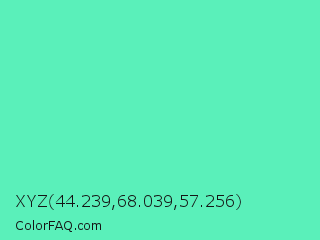 XYZ 44.239,68.039,57.256 Color is a light green color and the nearest color is Medium Aquamarine #66ddaa. Hex code #5af0ba and RGB value is rgb(90,240,186). In RGB color space, this color is composed of 35% red, 94% green, 73% blue, In CMYK color space, this color is composed of 63% cyan, 0% magenta, 23% yellow , 6% black , In HSL color space, this color has a hue angle of 158° , 83% saturation and 65% lightness.