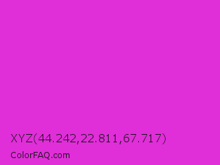 XYZ 44.242,22.811,67.717 Color is a normal magenta color and the nearest color is Steel Pink #cc33cc. Hex code #e02ed9 and RGB value is rgb(224,46,217). In RGB color space, this color is composed of 88% red, 18% green, 85% blue, In CMYK color space, this color is composed of 0% cyan, 79% magenta, 3% yellow , 12% black , In HSL color space, this color has a hue angle of 302° , 74% saturation and 53% lightness.