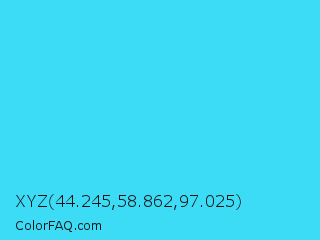XYZ 44.245,58.862,97.025 Color is a normal cyan color and the nearest color is Turquoise #40e0d0. Hex code #3cdcf7 and RGB value is rgb(60,220,247). In RGB color space, this color is composed of 24% red, 86% green, 97% blue, In CMYK color space, this color is composed of 76% cyan, 11% magenta, 0% yellow , 3% black , In HSL color space, this color has a hue angle of 189° , 92% saturation and 60% lightness.