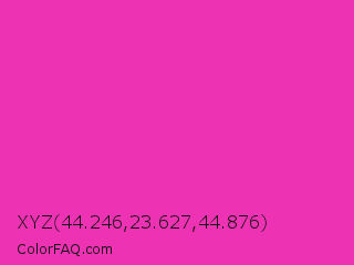 XYZ 44.246,23.627,44.876 Color is a normal magenta color and the nearest color is Frostbite #e936a7. Hex code #ed33b3 and RGB value is rgb(237,51,179). In RGB color space, this color is composed of 93% red, 20% green, 70% blue, In CMYK color space, this color is composed of 0% cyan, 78% magenta, 24% yellow , 7% black , In HSL color space, this color has a hue angle of 319° , 84% saturation and 56% lightness.