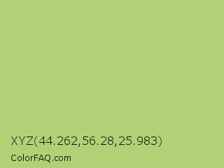 XYZ 44.262,56.28,25.983 Color is a light green color and the nearest color is Wild Willow #b9c46a. Hex code #b1d177 and RGB value is rgb(177,209,119). In RGB color space, this color is composed of 69% red, 82% green, 47% blue, In CMYK color space, this color is composed of 15% cyan, 0% magenta, 43% yellow , 18% black , In HSL color space, this color has a hue angle of 81° , 49% saturation and 64% lightness.