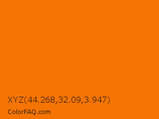 XYZ 44.268,32.09,3.947 Color is a normal orange color and the nearest color is Chilean Fire #f77703. Hex code #f67403 and RGB value is rgb(246,116,3). In RGB color space, this color is composed of 96% red, 45% green, 1% blue, In CMYK color space, this color is composed of 0% cyan, 53% magenta, 99% yellow , 4% black , In HSL color space, this color has a hue angle of 28° , 98% saturation and 49% lightness.