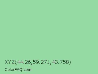 XYZ 44.26,59.271,43.758 Color is a light green color and the nearest color is Eton Blue #96c8a2. Hex code #96daa3 and RGB value is rgb(150,218,163). In RGB color space, this color is composed of 59% red, 85% green, 64% blue, In CMYK color space, this color is composed of 31% cyan, 0% magenta, 25% yellow , 15% black , In HSL color space, this color has a hue angle of 131° , 48% saturation and 72% lightness.
