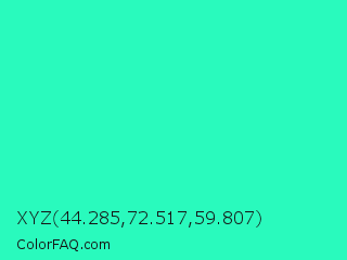 XYZ 44.285,72.517,59.807 Color is a normal green color and the nearest color is Turquoise PWG #30d5c8. Hex code #29fabd and RGB value is rgb(41,250,189). In RGB color space, this color is composed of 16% red, 98% green, 74% blue, In CMYK color space, this color is composed of 84% cyan, 0% magenta, 24% yellow , 2% black , In HSL color space, this color has a hue angle of 162° , 95% saturation and 57% lightness.
