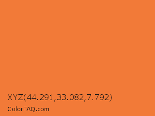 XYZ 44.291,33.082,7.792 Color is a normal orange color and the nearest color is Crusta #fd7b33. Hex code #f27a38 and RGB value is rgb(242,122,56). In RGB color space, this color is composed of 95% red, 48% green, 22% blue, In CMYK color space, this color is composed of 0% cyan, 50% magenta, 77% yellow , 5% black , In HSL color space, this color has a hue angle of 21° , 88% saturation and 58% lightness.