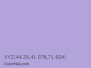 XYZ 44.29,41.078,71.924 Color is a light indigo color and the nearest color is Cold Purple #aba0d9. Hex code #b2a4da and RGB value is rgb(178,164,218). In RGB color space, this color is composed of 70% red, 64% green, 85% blue, In CMYK color space, this color is composed of 18% cyan, 25% magenta, 0% yellow , 15% black , In HSL color space, this color has a hue angle of 256° , 42% saturation and 75% lightness.