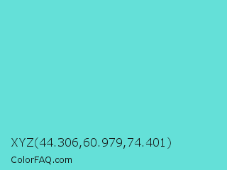 XYZ 44.306,60.979,74.401 Color is a light cyan color and the nearest color is Aquamarine Blue #71d9e2. Hex code #64e0d8 and RGB value is rgb(100,224,216). In RGB color space, this color is composed of 39% red, 88% green, 85% blue, In CMYK color space, this color is composed of 55% cyan, 0% magenta, 4% yellow , 12% black , In HSL color space, this color has a hue angle of 176° , 67% saturation and 64% lightness.