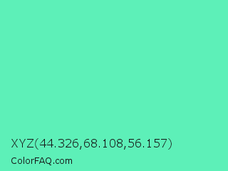 XYZ 44.326,68.108,56.157 Color is a light green color and the nearest color is Medium Aquamarine #66ddaa. Hex code #5df0b8 and RGB value is rgb(93,240,184). In RGB color space, this color is composed of 36% red, 94% green, 72% blue, In CMYK color space, this color is composed of 61% cyan, 0% magenta, 23% yellow , 6% black , In HSL color space, this color has a hue angle of 157° , 83% saturation and 65% lightness.