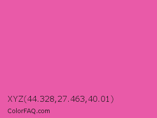 XYZ 44.328,27.463,40.01 Color is a light magenta color and the nearest color is Brilliant Rose #f653a6. Hex code #e95aa8 and RGB value is rgb(233,90,168). In RGB color space, this color is composed of 91% red, 35% green, 66% blue, In CMYK color space, this color is composed of 0% cyan, 61% magenta, 28% yellow , 9% black , In HSL color space, this color has a hue angle of 327° , 76% saturation and 63% lightness.