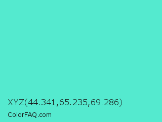 XYZ 44.341,65.235,69.286 Color is a light cyan color and the nearest color is Turquoise #40e0d0. Hex code #54eacf and RGB value is rgb(84,234,207). In RGB color space, this color is composed of 33% red, 92% green, 81% blue, In CMYK color space, this color is composed of 64% cyan, 0% magenta, 12% yellow , 8% black , In HSL color space, this color has a hue angle of 169° , 78% saturation and 62% lightness.
