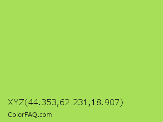XYZ 44.353,62.231,18.907 Color is a light green color and the nearest color is Conifer #acdd4d. Hex code #a7e058 and RGB value is rgb(167,224,88). In RGB color space, this color is composed of 65% red, 88% green, 35% blue, In CMYK color space, this color is composed of 25% cyan, 0% magenta, 61% yellow , 12% black , In HSL color space, this color has a hue angle of 85° , 69% saturation and 61% lightness.