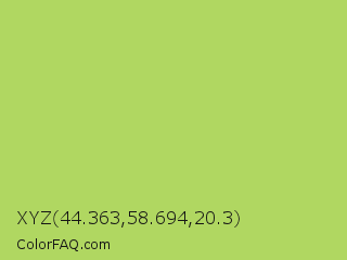 XYZ 44.363,58.694,20.3 Color is a light green color and the nearest color is June Bud #bdda57. Hex code #b0d761 and RGB value is rgb(176,215,97). In RGB color space, this color is composed of 69% red, 84% green, 38% blue, In CMYK color space, this color is composed of 18% cyan, 0% magenta, 55% yellow , 16% black , In HSL color space, this color has a hue angle of 80° , 60% saturation and 61% lightness.