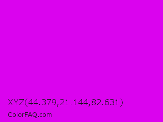 XYZ 44.379,21.144,82.631 Color is a normal magenta color and the nearest color is Phlox #df00ff. Hex code #da03ee and RGB value is rgb(218,3,238). In RGB color space, this color is composed of 85% red, 1% green, 93% blue, In CMYK color space, this color is composed of 8% cyan, 99% magenta, 0% yellow , 7% black , In HSL color space, this color has a hue angle of 295° , 98% saturation and 47% lightness.