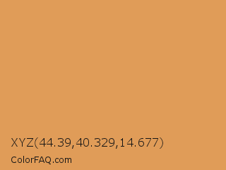 XYZ 44.39,40.329,14.677 Color is a light orange color and the nearest color is Di Serria #db995e. Hex code #e09c58 and RGB value is rgb(224,156,88). In RGB color space, this color is composed of 88% red, 61% green, 35% blue, In CMYK color space, this color is composed of 0% cyan, 30% magenta, 61% yellow , 12% black , In HSL color space, this color has a hue angle of 30° , 69% saturation and 61% lightness.