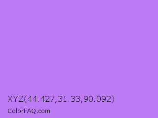 XYZ 44.427,31.33,90.092 Color is a light purple color and the nearest color is Lavender #b57edc. Hex code #bd7af5 and RGB value is rgb(189,122,245). In RGB color space, this color is composed of 74% red, 48% green, 96% blue, In CMYK color space, this color is composed of 23% cyan, 50% magenta, 0% yellow , 4% black , In HSL color space, this color has a hue angle of 273° , 86% saturation and 72% lightness.