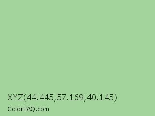 XYZ 44.445,57.169,40.145 Color is a light green color and the nearest color is Granny Smith Apple Crayola #9de093. Hex code #a2d49c and RGB value is rgb(162,212,156). In RGB color space, this color is composed of 64% red, 83% green, 61% blue, In CMYK color space, this color is composed of 24% cyan, 0% magenta, 26% yellow , 17% black , In HSL color space, this color has a hue angle of 114° , 39% saturation and 72% lightness.