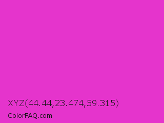 XYZ 44.44,23.474,59.315 Color is a normal magenta color and the nearest color is Steel Pink #cc33cc. Hex code #e534cc and RGB value is rgb(229,52,204). In RGB color space, this color is composed of 90% red, 20% green, 80% blue, In CMYK color space, this color is composed of 0% cyan, 77% magenta, 11% yellow , 10% black , In HSL color space, this color has a hue angle of 308° , 77% saturation and 55% lightness.