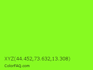 XYZ 44.452,73.632,13.308 Color is a normal green color and the nearest color is Spring Frost #87ff2a. Hex code #87fa21 and RGB value is rgb(135,250,33). In RGB color space, this color is composed of 53% red, 98% green, 13% blue, In CMYK color space, this color is composed of 46% cyan, 0% magenta, 87% yellow , 2% black , In HSL color space, this color has a hue angle of 92° , 96% saturation and 55% lightness.