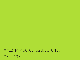 XYZ 44.466,61.623,13.041 Color is a normal lime color and the nearest color is Conifer #acdd4d. Hex code #afde36 and RGB value is rgb(175,222,54). In RGB color space, this color is composed of 69% red, 87% green, 21% blue, In CMYK color space, this color is composed of 21% cyan, 0% magenta, 76% yellow , 13% black , In HSL color space, this color has a hue angle of 77° , 72% saturation and 54% lightness.